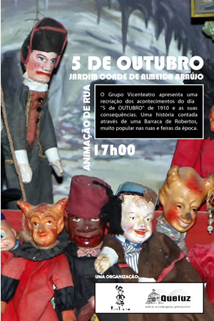 No próximo dia 5 de Outubro comemora-se o primeiro centenário da Implantação da República. A Junta de Freguesia de Queluz, vai realizar no Jardim Conde de Almeida Araújo pelas 17h00 uma animação de Rua com o Grupo Vicenteatro que irá colocar em cena a peça "5 de Outubro".